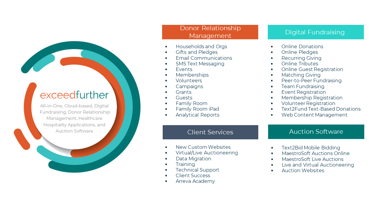 Arreva’s, ExceedFurther® All-in-One, Fundraising and Donor Relationship Management, Healthcare Hospitality, and Auction Online Donor Software is helping nonprofits worldwide further their mission, transform fundraising, and cultivate relationships with donors and constituents.